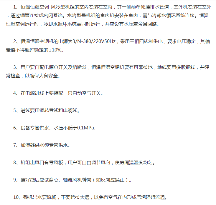 隨便拿出一點分享給大家,就能看到恒溫恒濕空調(diào)安裝的注意事項有十多個項目,足見其重要性。